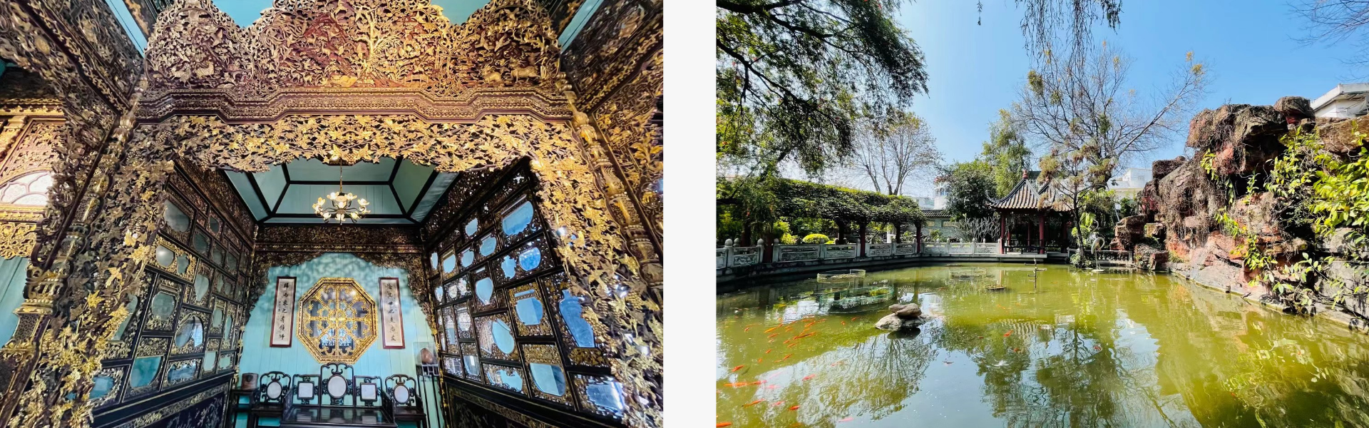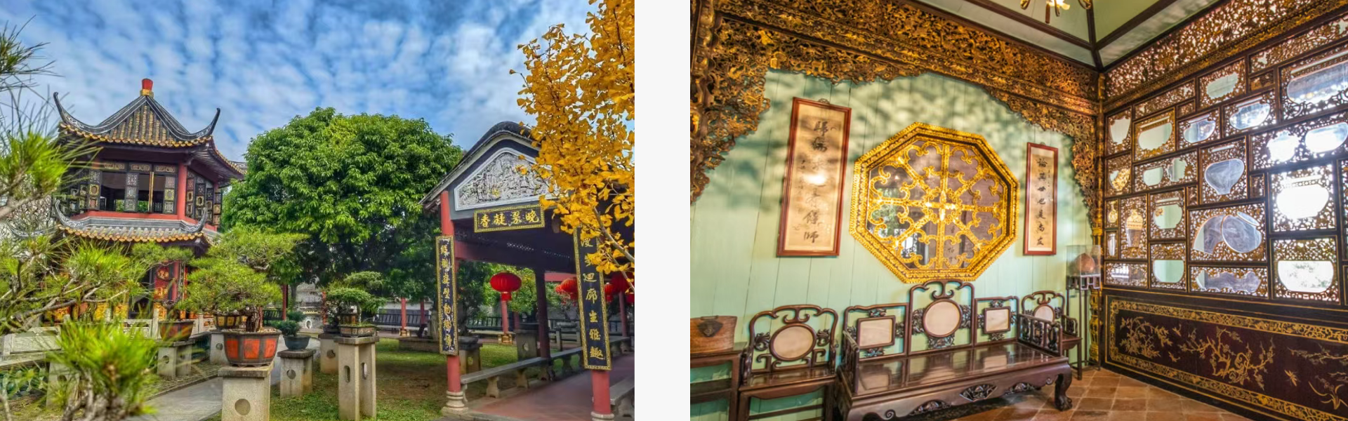 uStepping into the Qing Dynasty Lingnan mansion with the legend of 'The Golden House Hides the Beauty,' you will be amazed by the exquisite wood carvings inlaid with real gold, brilliantly magnificent, and imagine the elegant life of talented scholars and beautiful ladies adding fragrance with their red sleeves back in the day.