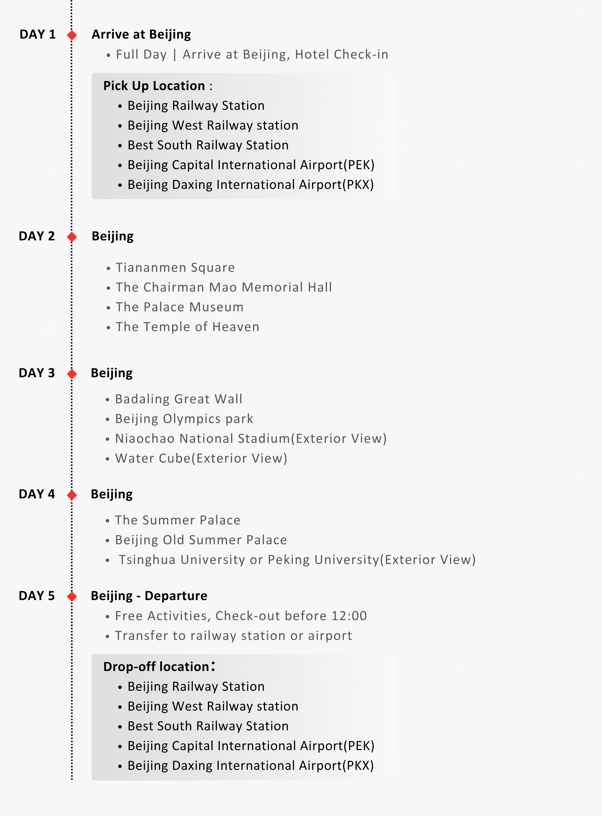 ◆ Welcome to Beijing! Our company's pick-up staff will contact you the day before your arrival in Beijing. Upon arrival, our specially assigned pick-up personnel will meet you and take you to the corresponding hotel. There are no activity arrangements for that day.