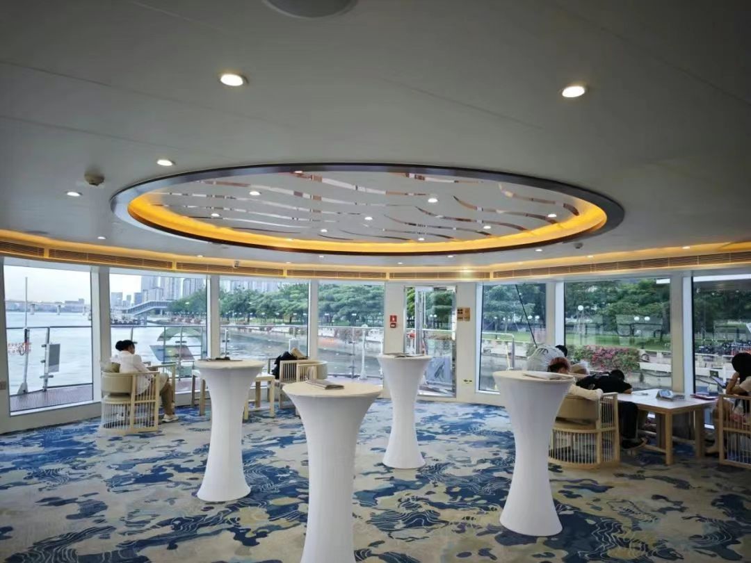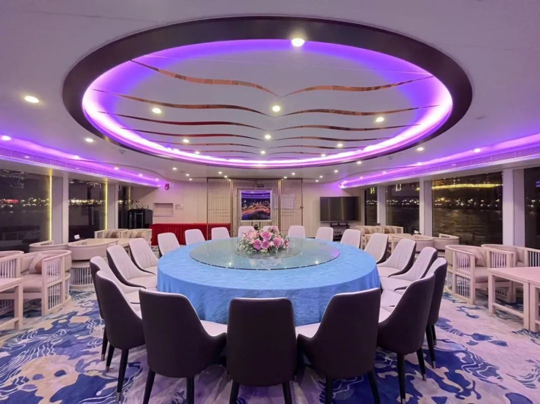 The first floor features a large curved high-definition LED screen and professional high-end audio control equipment. The cabins have large floor-to-ceiling windows that are bright and transparent, offering unobstructed views of the Pearl River scenery.