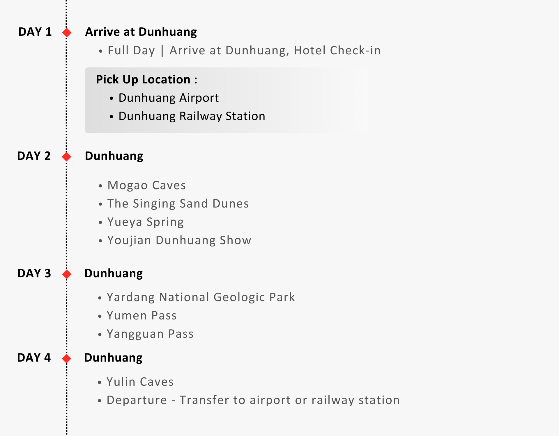 End of the tour, return to Dunhuang city and transfer to railway station or airport.