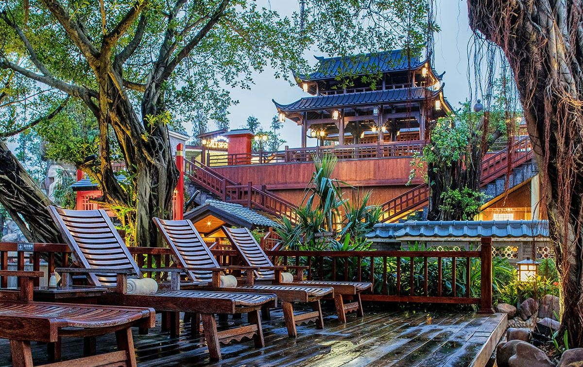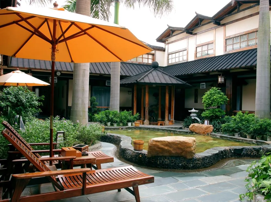 A "star attraction in Zhuhai tourism" certified by the China National Tourism Administration. The resort features 24/7 access to natural hot springs including Huaxing Pool, Liufu Spring, Mingjiu Spring, and Shibanshan Hot Spring (a geothermal spring). Two natural spring outlets provide 70°C mineral water rich in polysilicic acid, lithium, bromine, and other beneficial components. The resort boasts a Cantonese-Chinese restaurant and karaoke lounge, showcasing Tang Dynasty-inspired aesthetics with rustic wooden cottages, artificial hills, cascading waterfalls, and arched bridges. Upon opening the wooden lattice door, guests discover a cozy, countryside-style room adorned with traditional furnishings. Guests can even step into a customer service role, wearing wooden clogs and stepping out of the window to breathe in the fresh air of rural life.