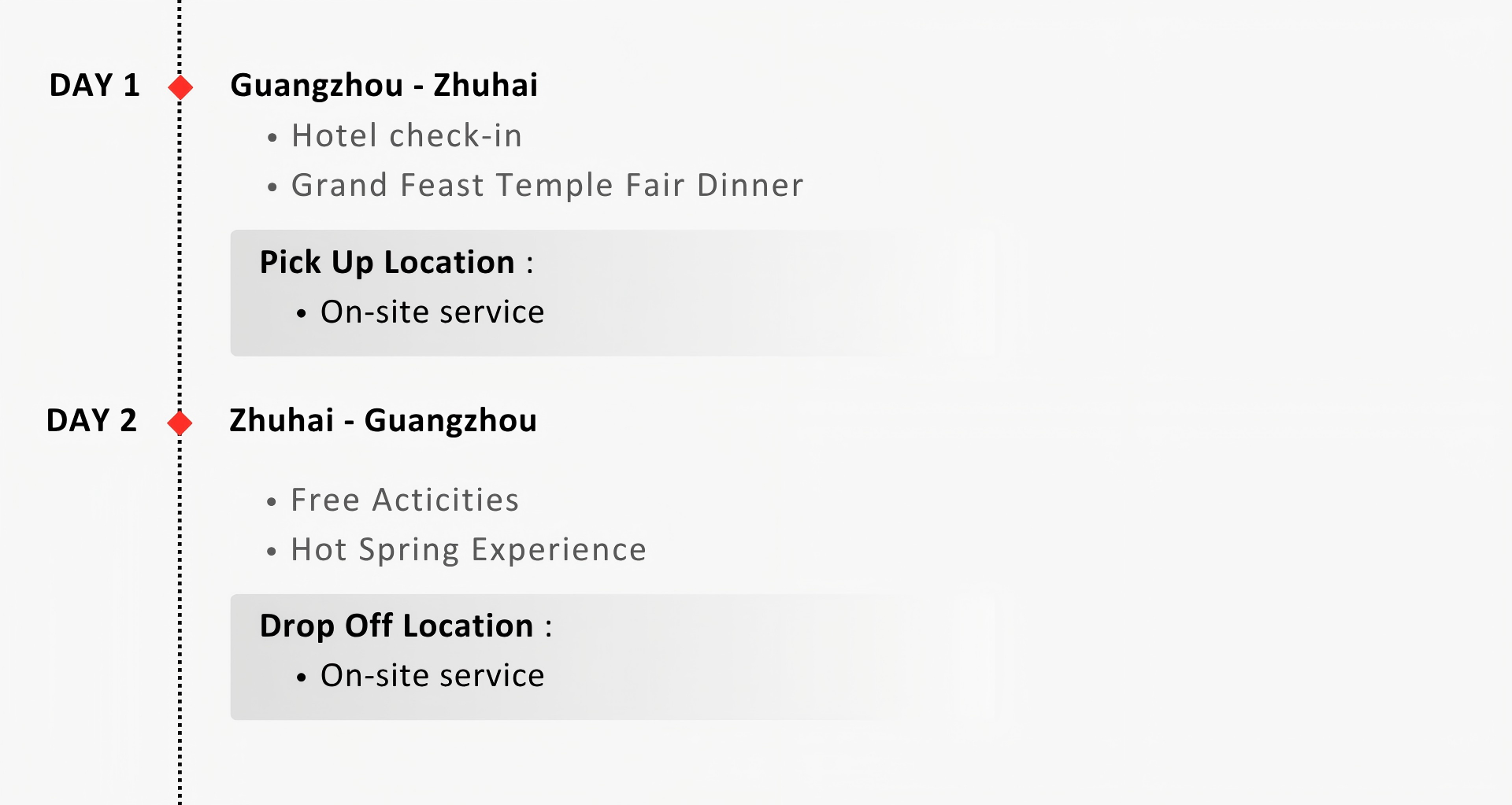 uAfter pick-up, departing for [Zhuhai] (approximately 1.5-hour drive).