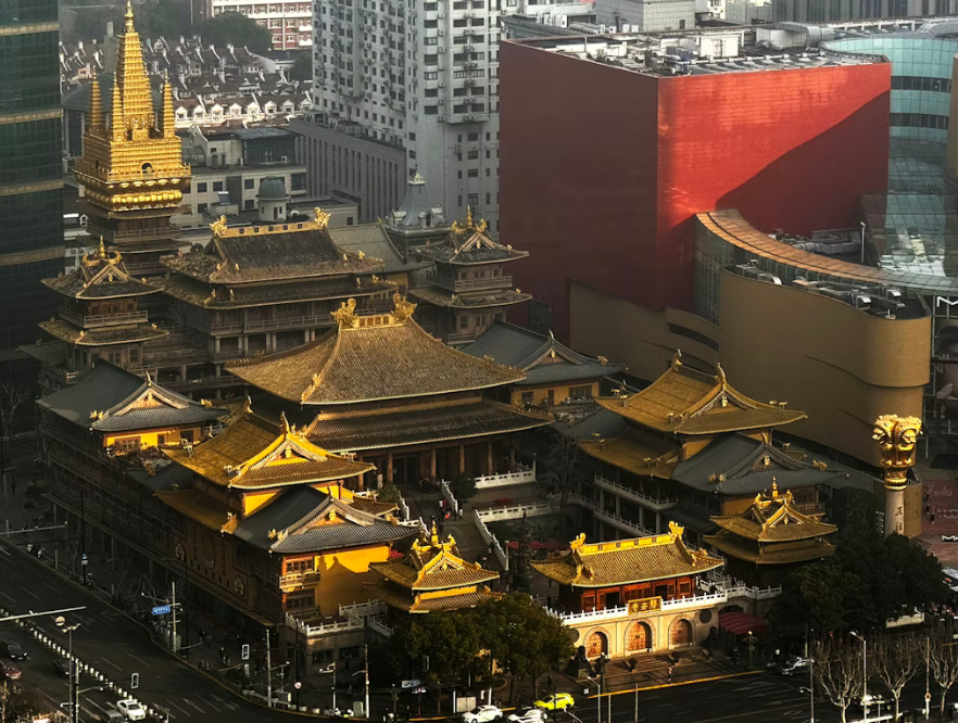 The uniqueness of Jing'an Temple lies in its striking visual contrast: a magnificent golden Tantric Buddhist temple encircled by the cold glass curtain walls of modern skyscrapers. This juxtaposition of ancient faith and modern commerce creates one of Shanghai's most iconic scenes.