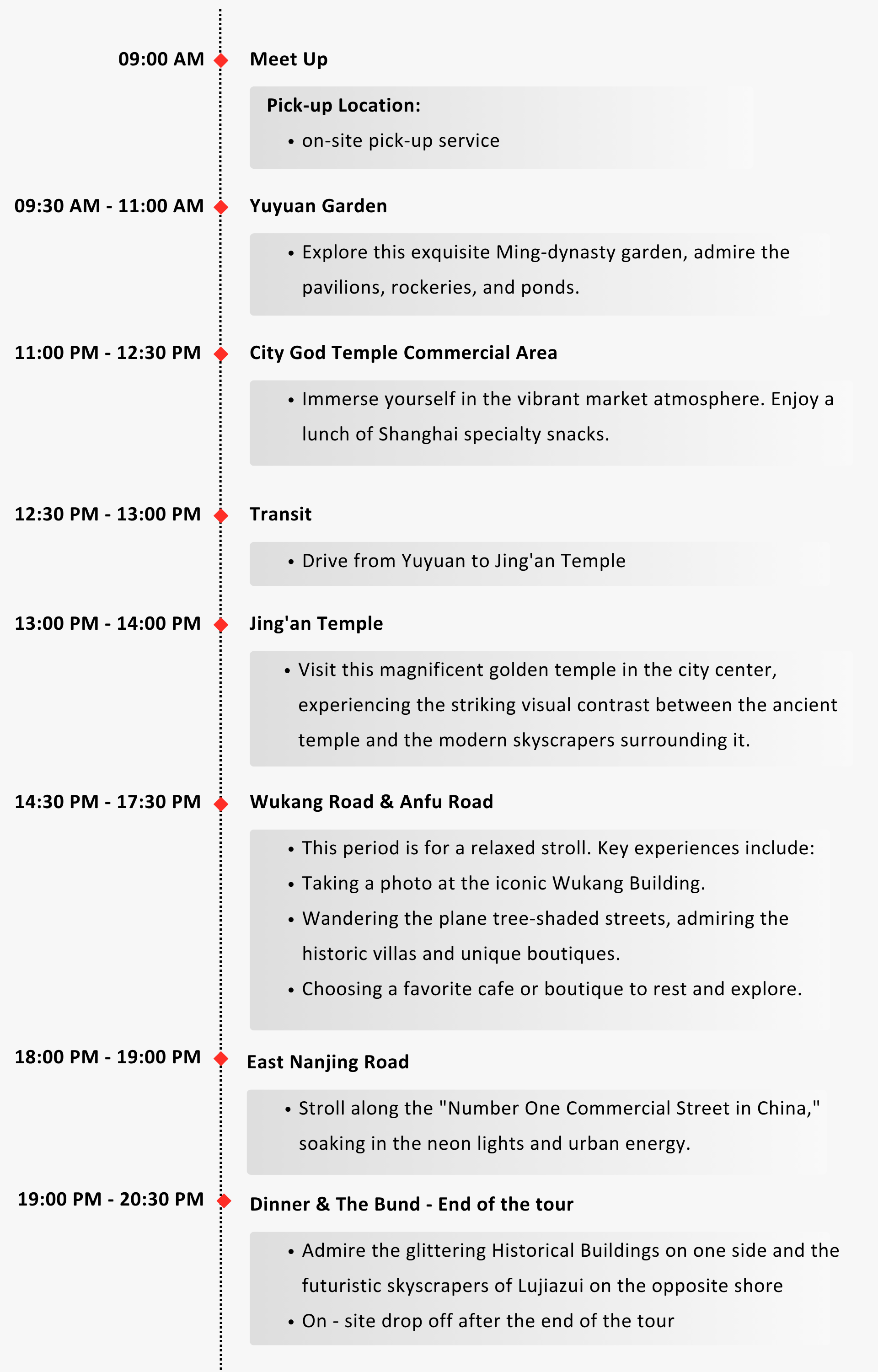 Experience dramatic shifts in time and space: from the classical elegance of a Ming-dynasty garden (Yuyuan) to the striking contrast of an ancient golden temple (Jing'an Temple) against modern skyscrapers, then to the romantic, historical French Concession streets (Wukang Road), and finally to the iconic showdown between the colonial-era buildings of the Bund and the futuristic skyline of Lujiazui.