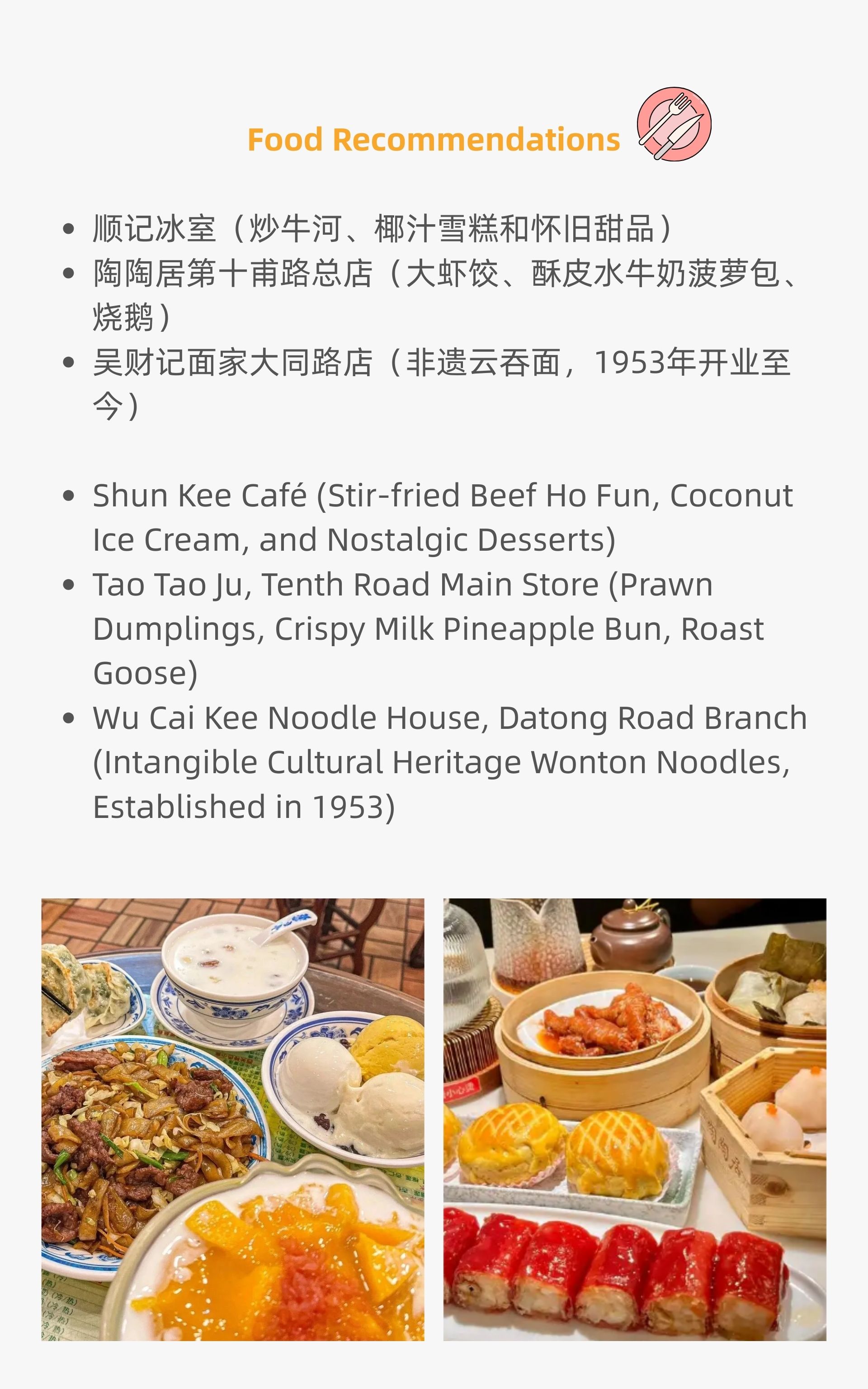 In the historic arcade street area here, there are still many time-honored food establishments. Recommended are Shun Kee Café’s signature coconut juice ice cream with mango pomelo sago, stir-fried beef rice noodles, and boat congee; as well as Tao Tao Ju on Shifu Road’s main branch for its prawn dumplings, crispy milk pineapple buns, and roast goose; and Wu Cai Kee Noodle House on Datong Road for its intangible cultural heritage wonton noodles.