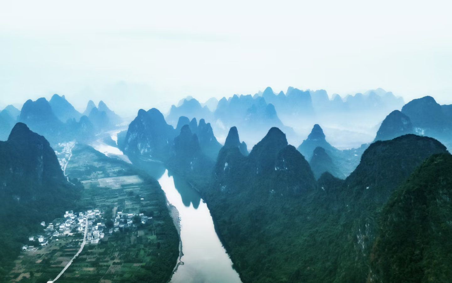 In winter, the mountains and waters of Guilin become peaceful, and the misty peaks outline a beautiful Chinese painting.