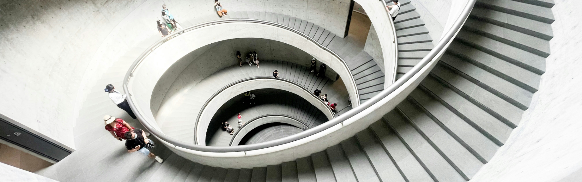 The double-helix staircase and the interplay of concrete walls with natural light are masterclasses in architectural photography and spatial design.